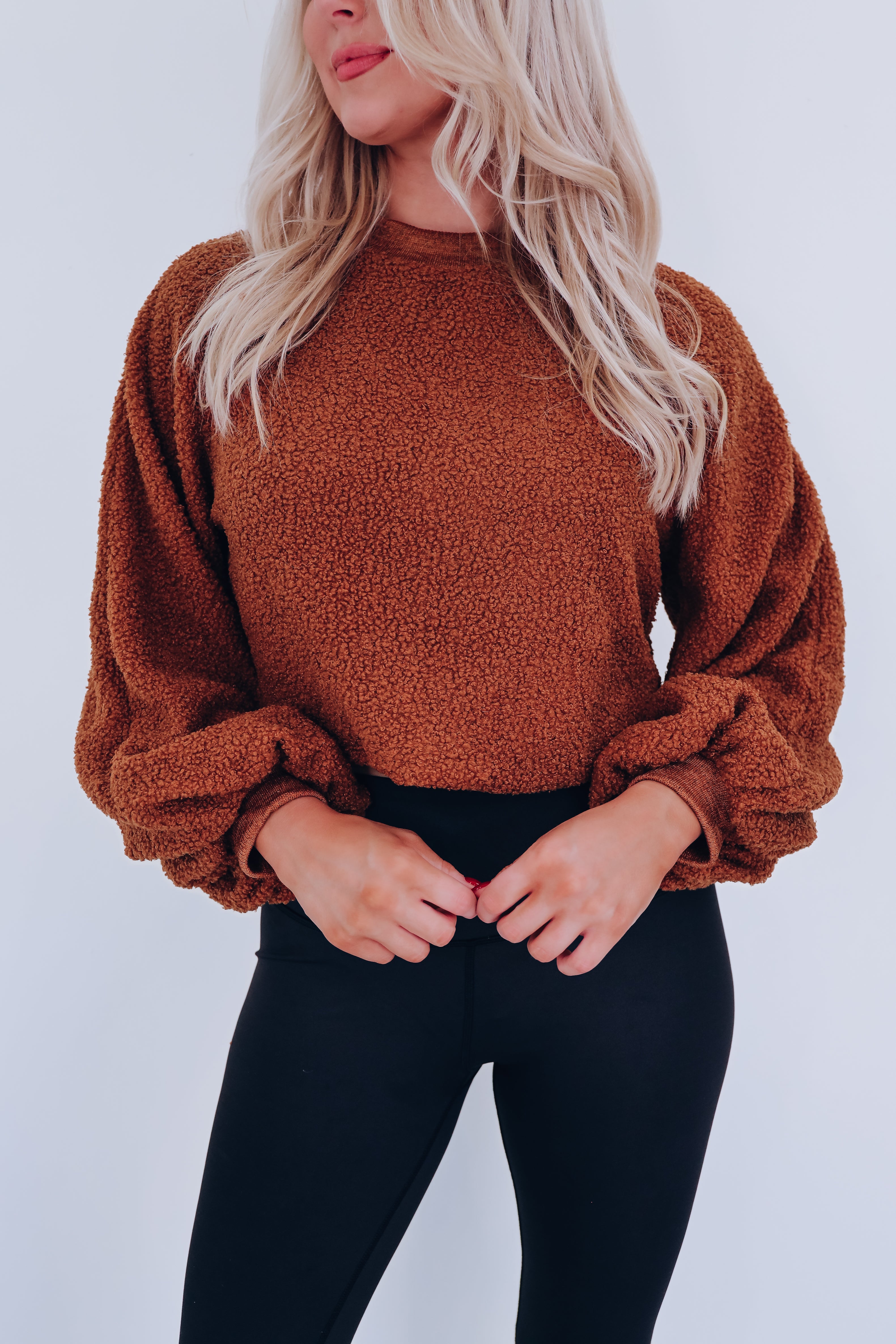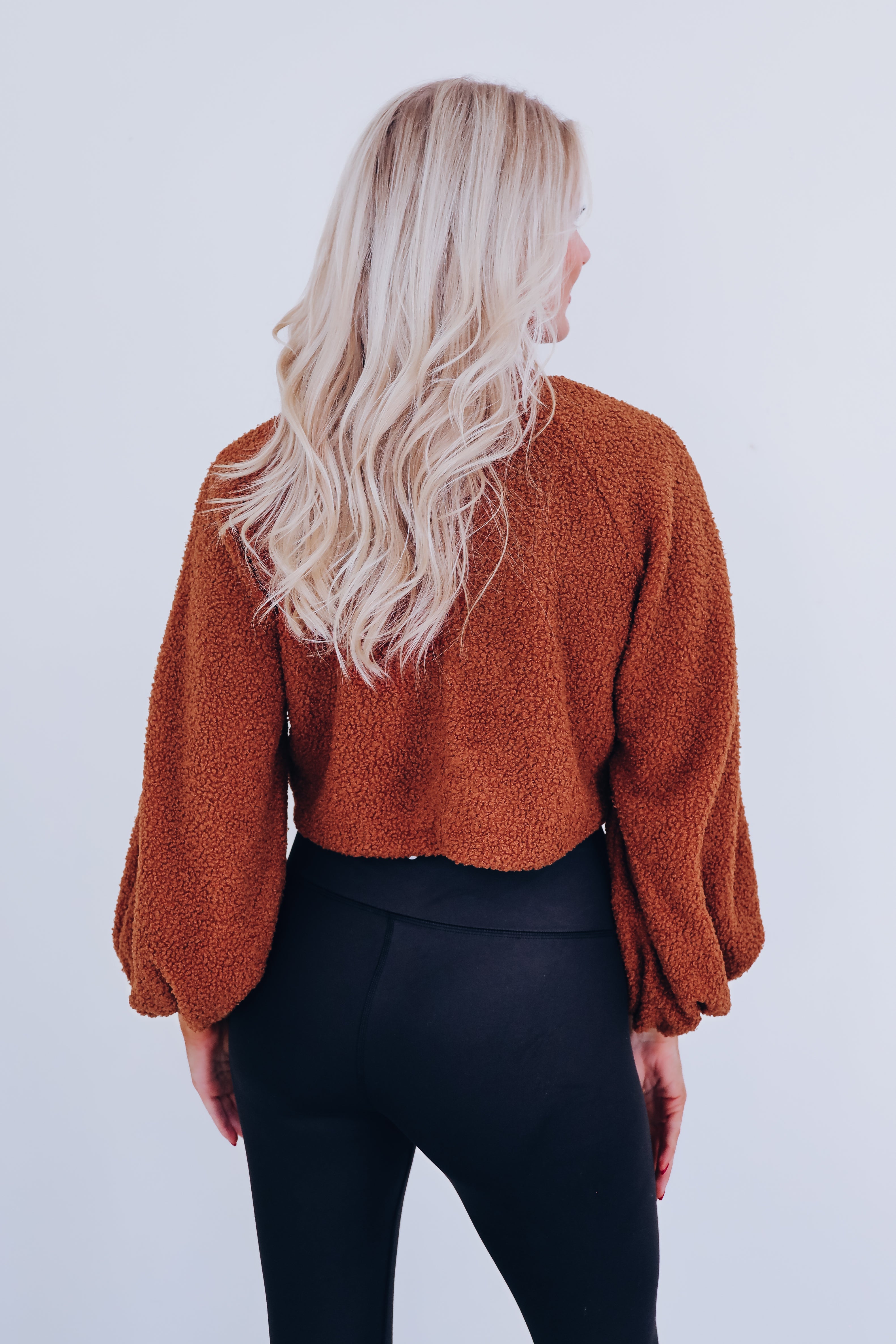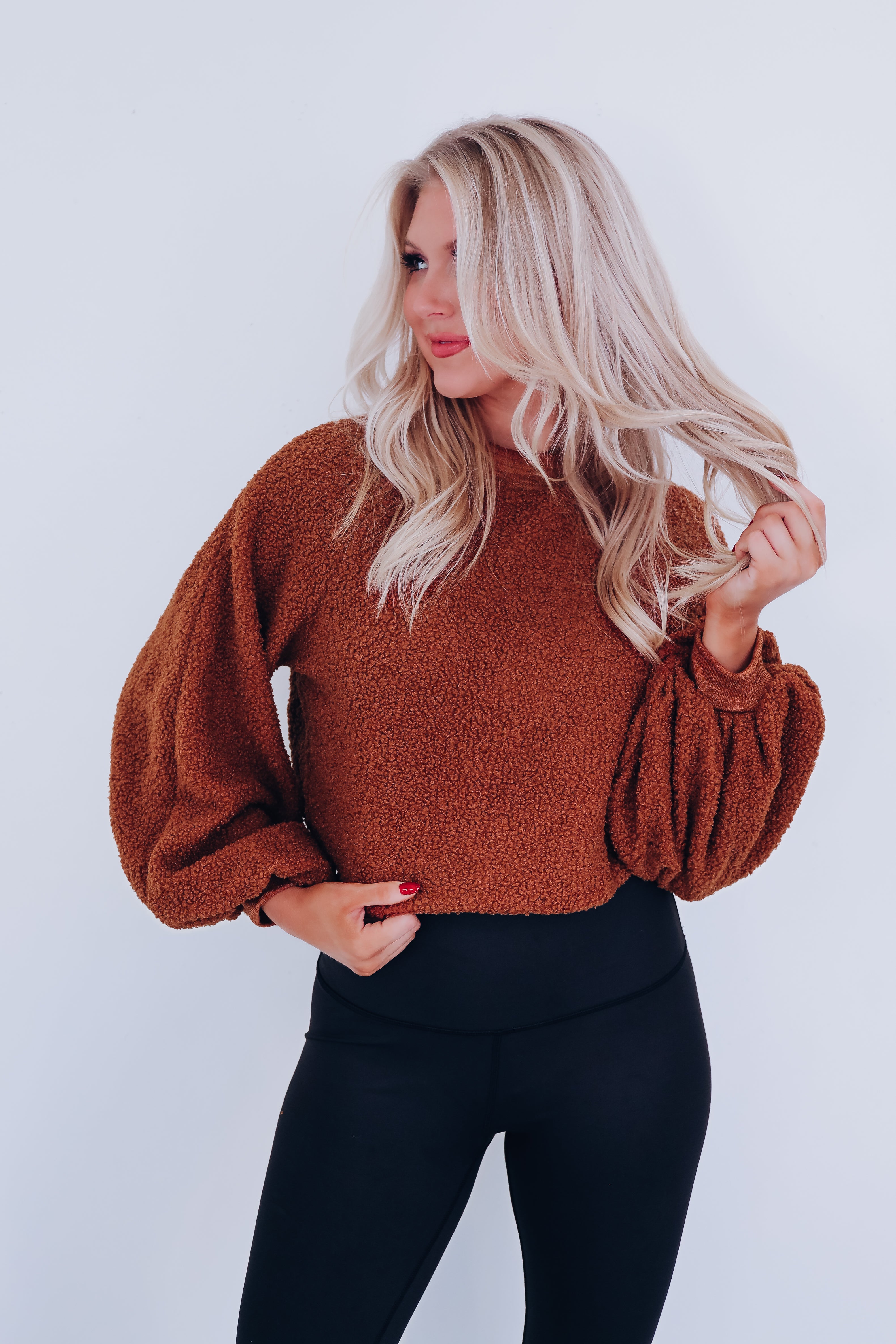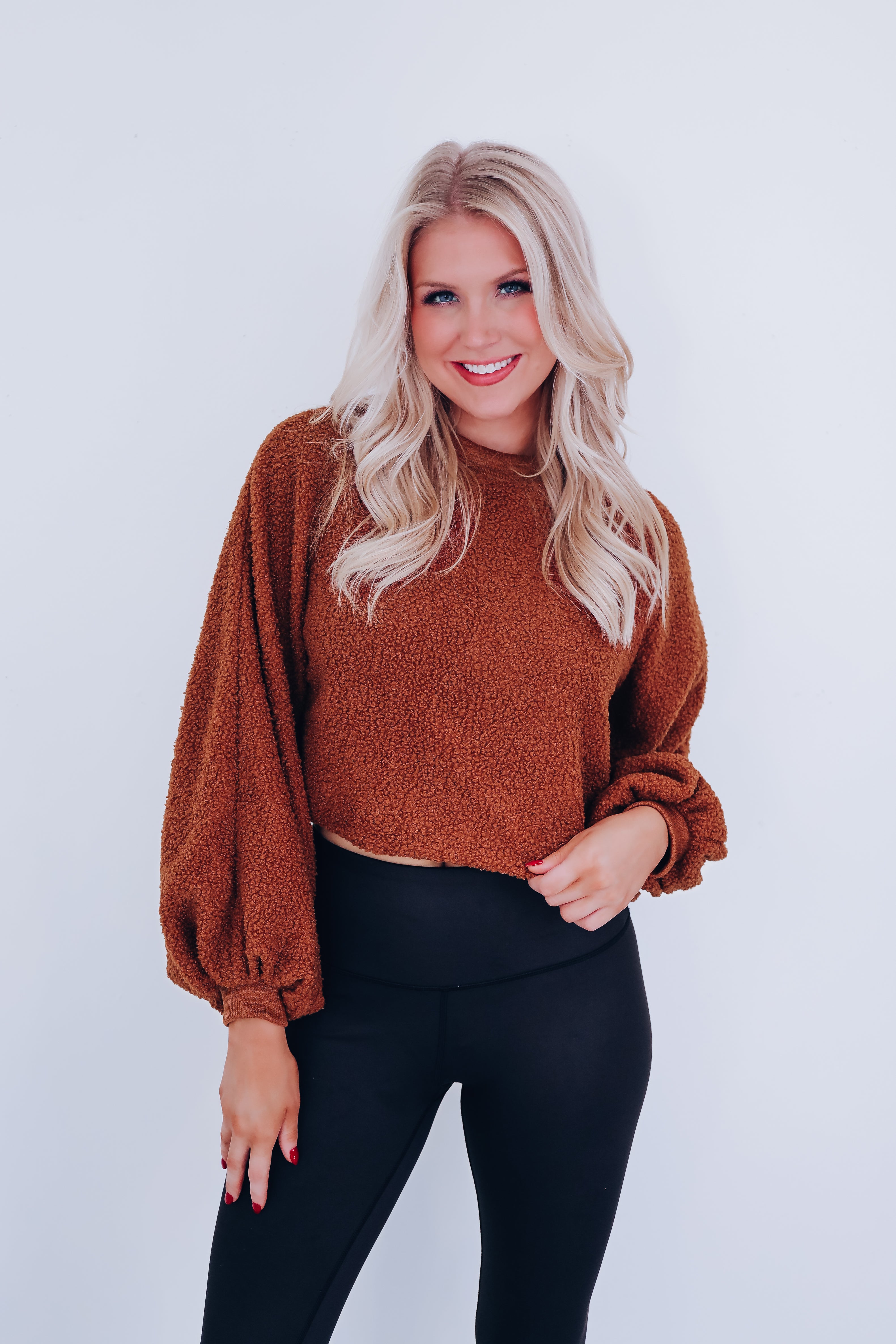 Features a sherpa fabric body with a satin lining, a boxy cropped silhouette, a full length balloon sleeve, a crew neck, and a cropped straight hem.