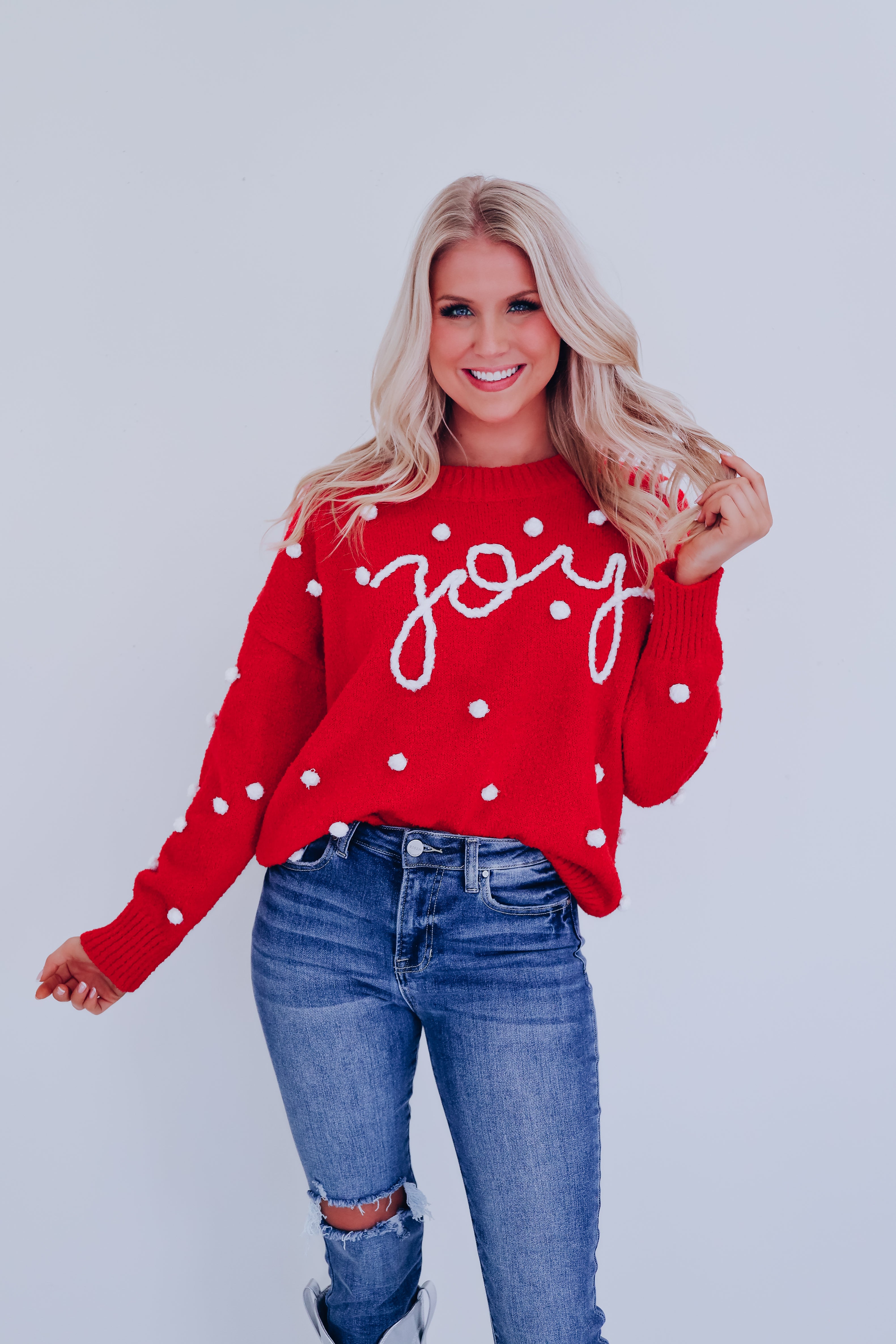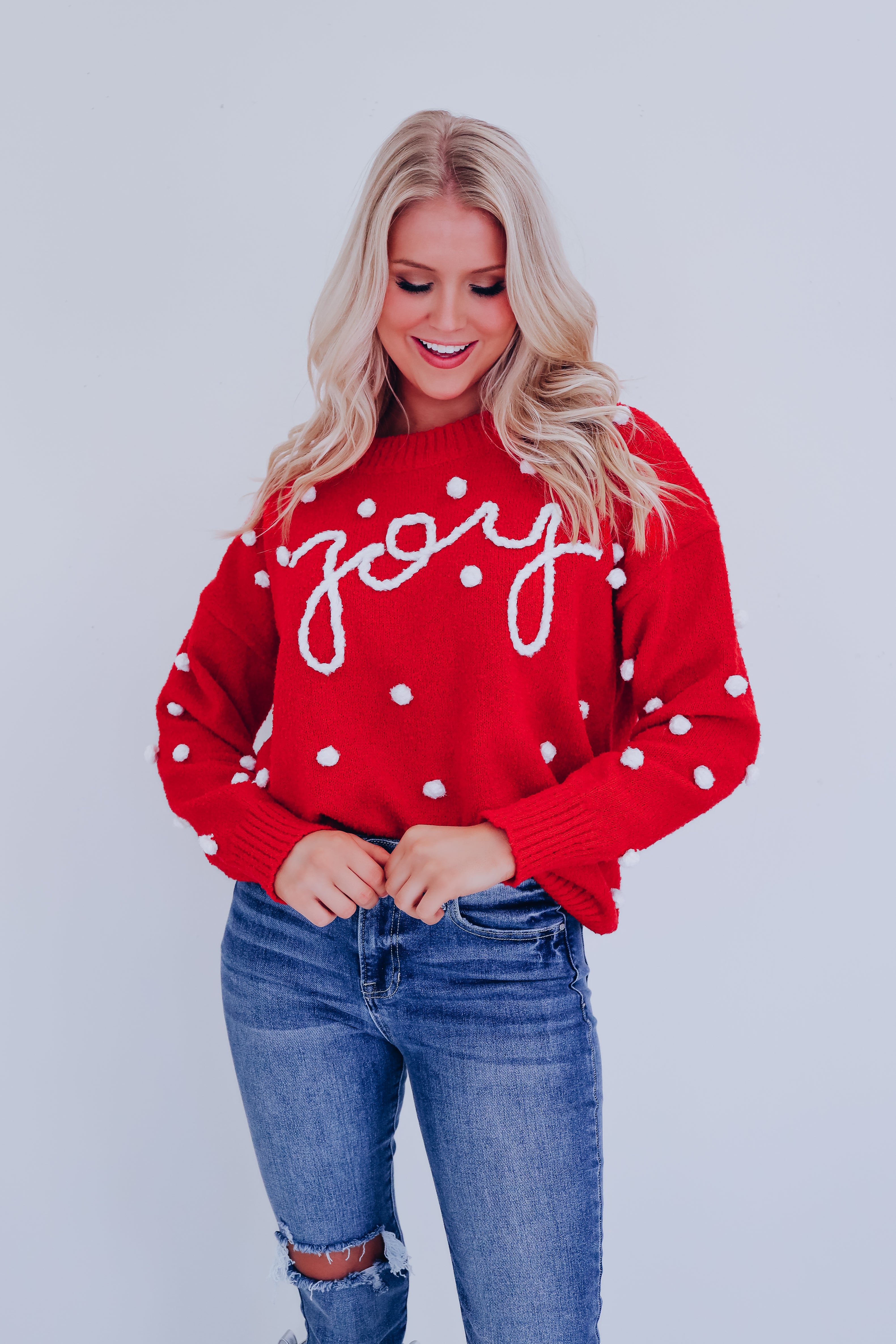 Features a super soft knobbed knit fabric, a crew neck, a full length sleeve with ribbed cuff, “Joy” embroidered on the front with tiny pom poms decorating the front and the sleeves, with a straight ribbed hem.
