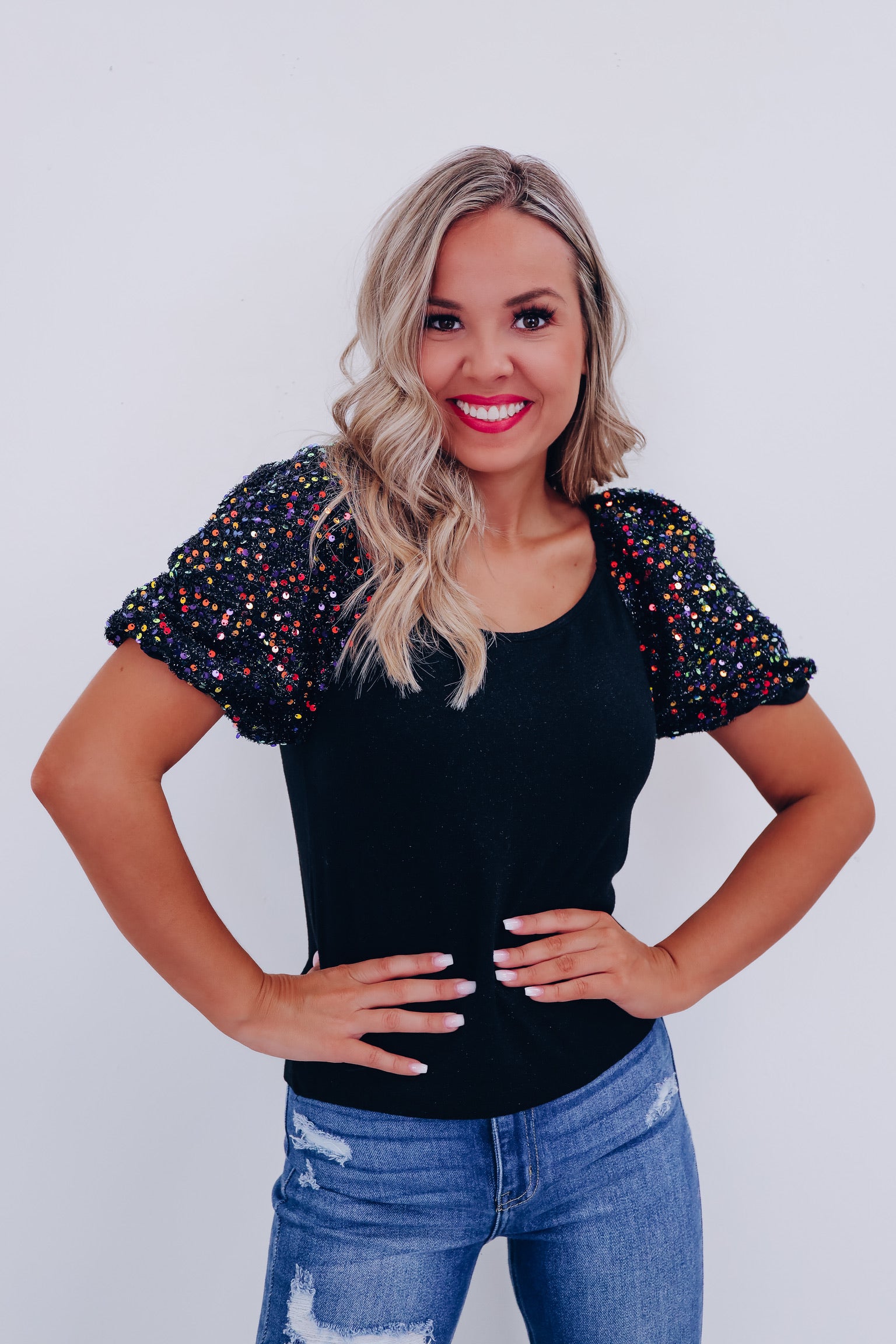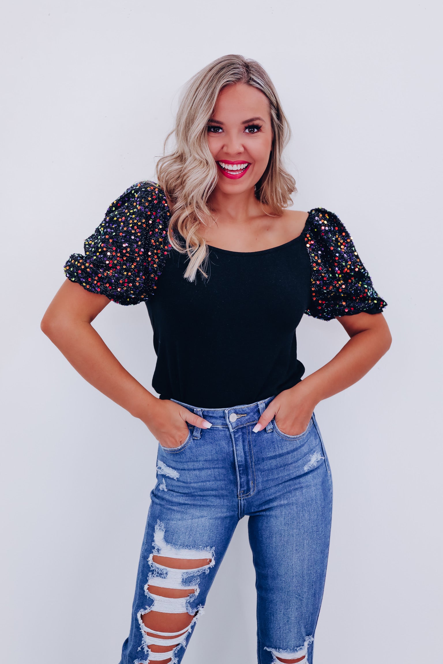 / Iberdist Piper Sequin Puff Sleeve Top – Black