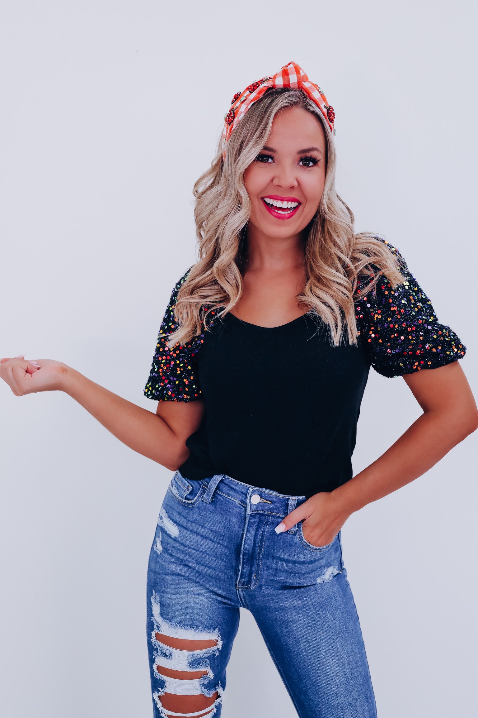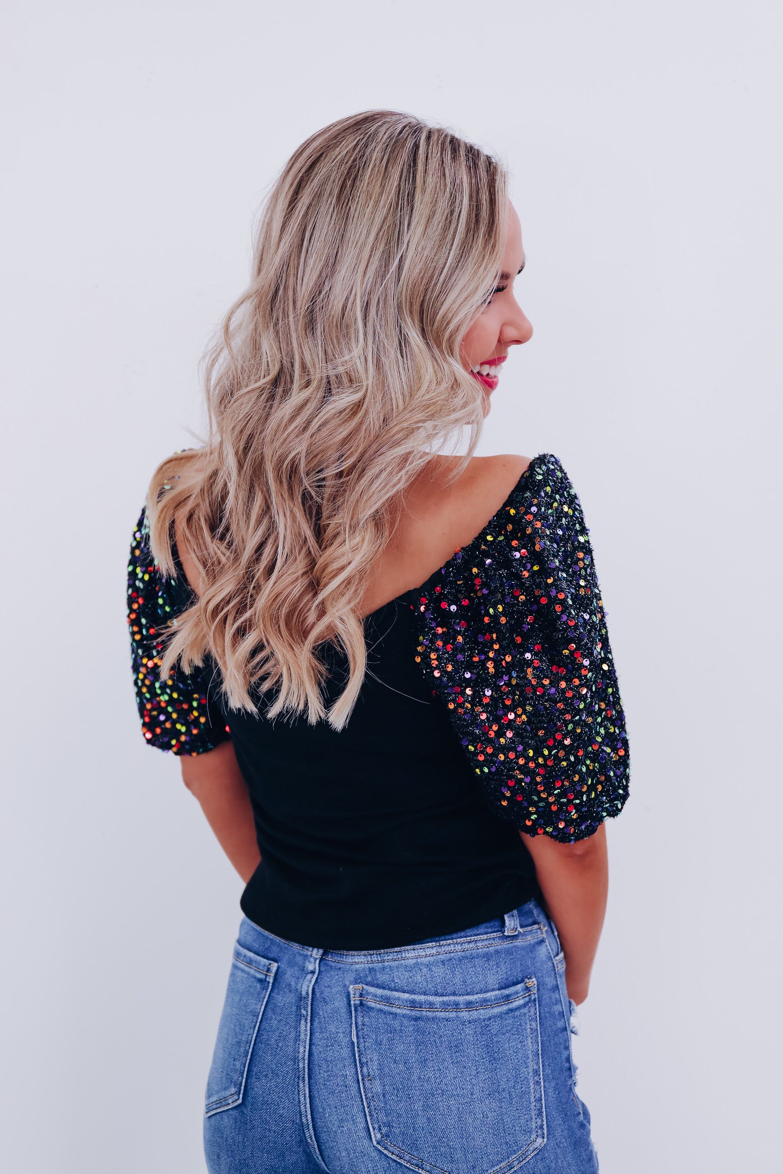 Features a soft black fabric, a square neck, a multi color iridescent sequin puff short sleeve, and a straight cropped hem.