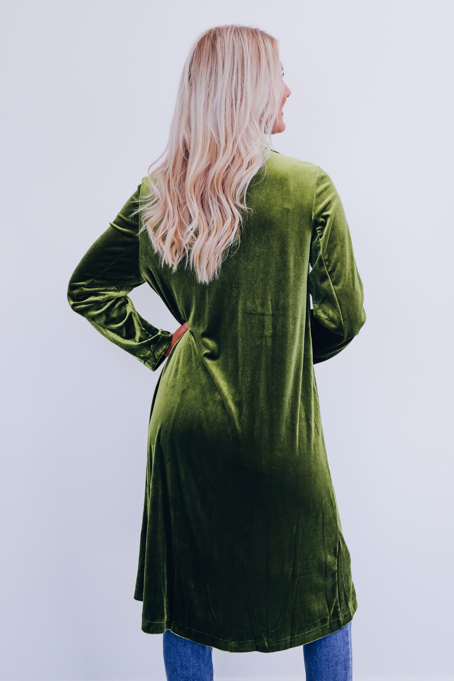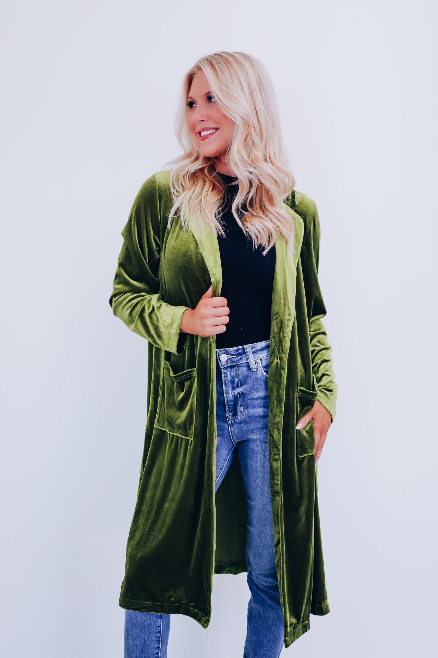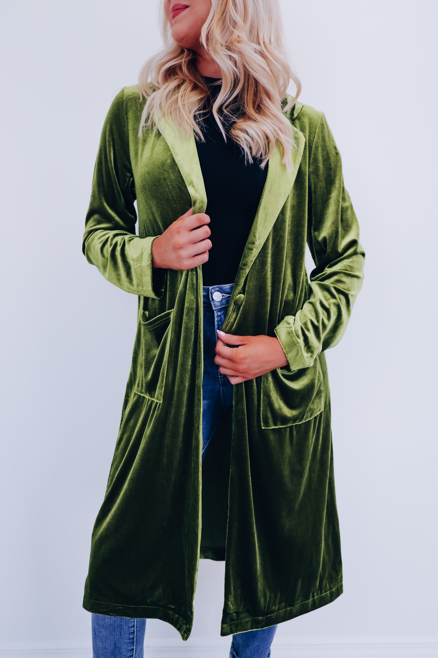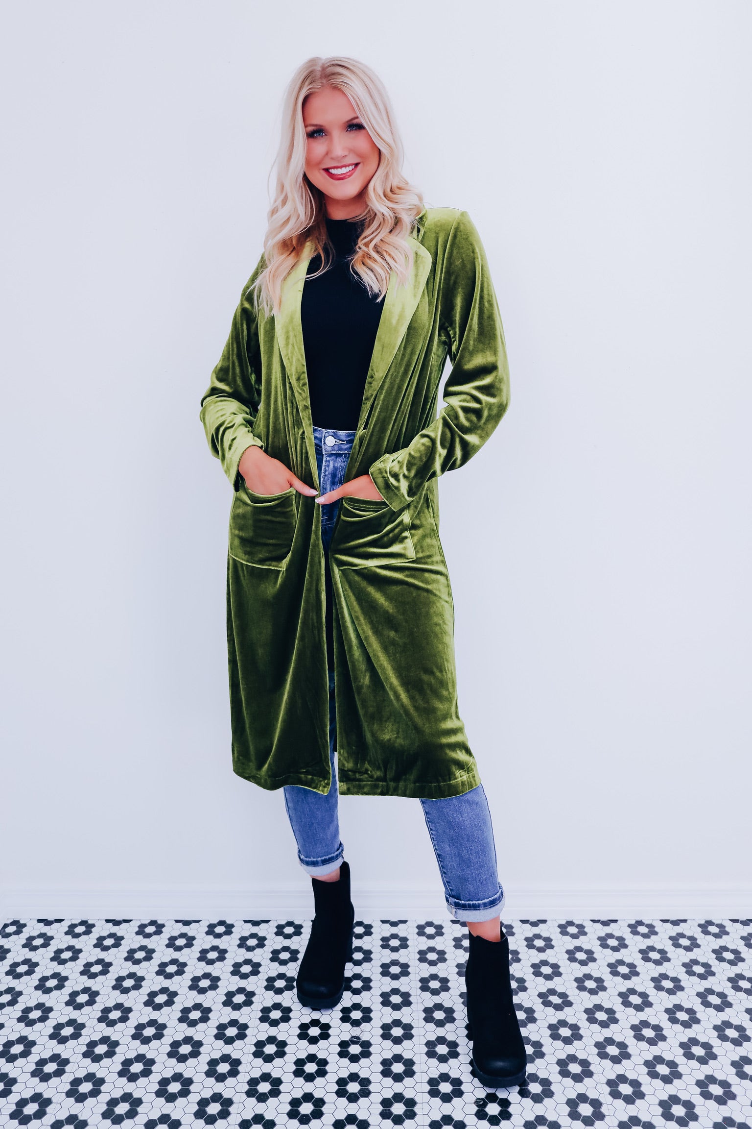 Features a soft velvet fabric, a notched collar, one button front closure, full length sleeves, two patch pockets, and a longline hem.