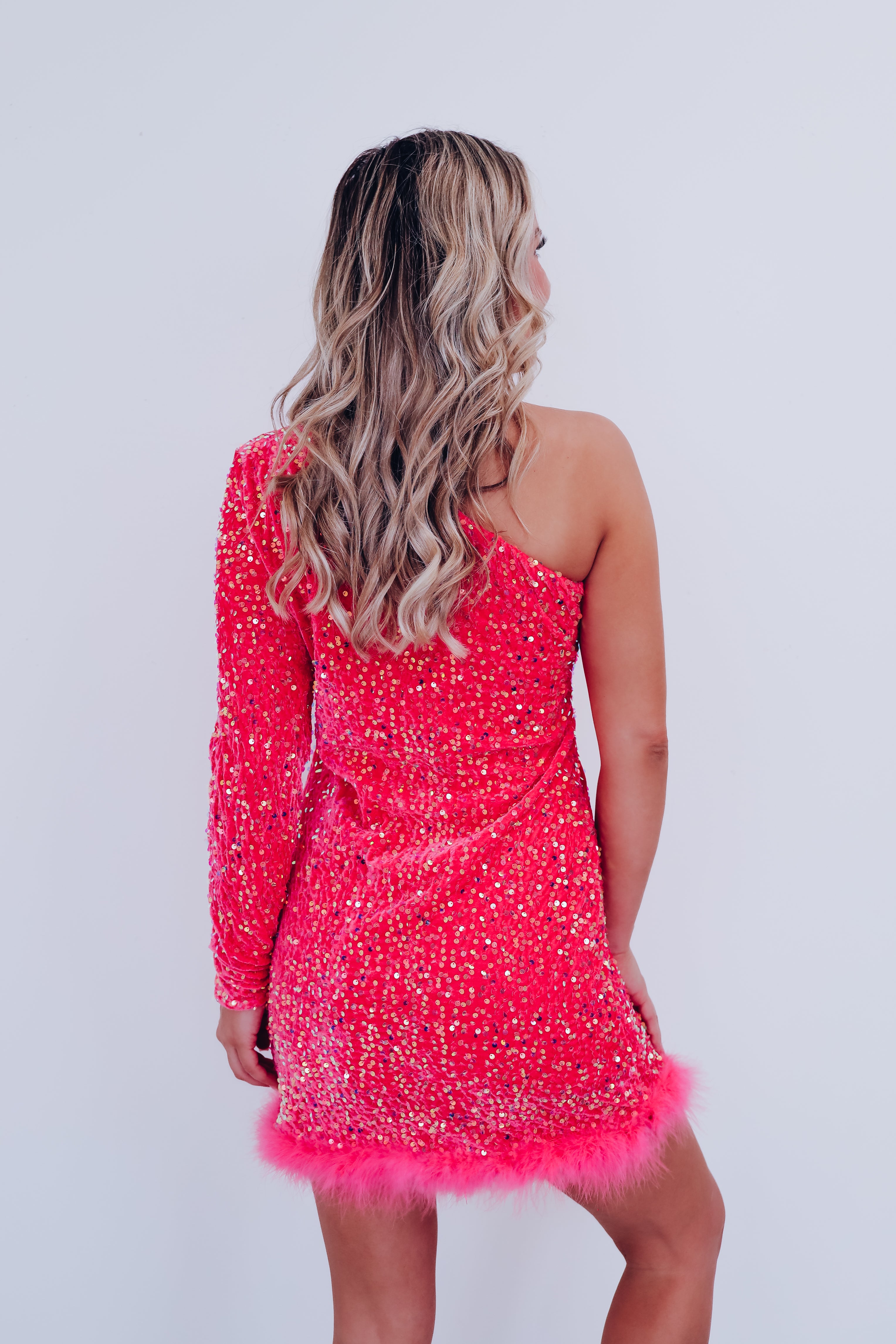 Features a velvet and iridescent sequin fabric, a one shoulder full length sleeve silhouette, a mini length with a faux feather trim hem.